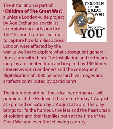 The Children of The Great War installation reveals the stories of those who took part in the war, telling of their loves and their losses and of the effect upon their family's journey to now and beyond. |